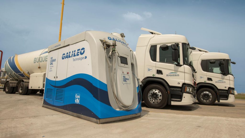 Buquebus, a tourism and river transport company between Argentina and Uruguay, announces a new step towards its goal of sustainable development after having incorporated a modular “Galileo Patagonia” LNG refueling station and two Scania trucks powered entirely by the same type of energy.